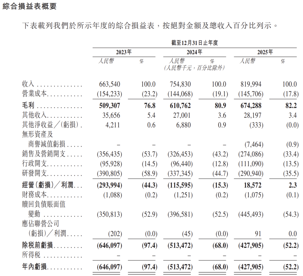 近三年来,公司营收保持稳健增长,从2023年的6.64亿元增长13.8%至2024年的7.55亿元,并于2025年实现营收8.2亿元。公司2023年、2024年及2025年的毛利率分别为76.8%、80.9%及82.2%,其增长主要得益于公司提升成本效益策略,强调技术升级及精细化管理。