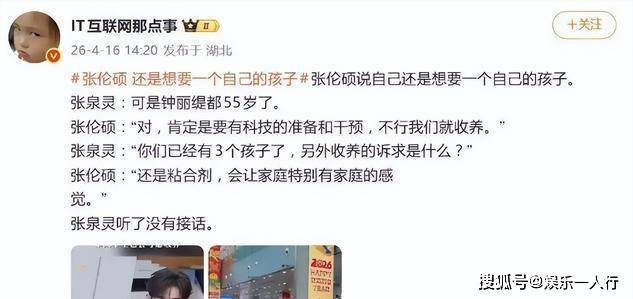 2026年4月14日,综艺《初入职场的我们·金融季》最新一期播出。 43岁的张伦硕当着55岁妻子钟丽缇的面,对着镜头坦然说出:“我还是想要一个自己的孩子。 ”他随即补充了方案:“肯定要有科技的准备与干预,不行我们就收养也没问题。 ”这句“孩子是家庭的粘合剂,有了孩子家才更有家庭的感觉”,让身旁的钟丽缇全程低头沉默,指尖微攥。 主持人张泉灵在现场直接提醒张伦硕:“可是雅雅姐55了吧? ”张伦硕点头承认,并再次强调了借助科技手段的可能性。 张泉灵听完后,没忍住当场翻了一个明显的白眼。