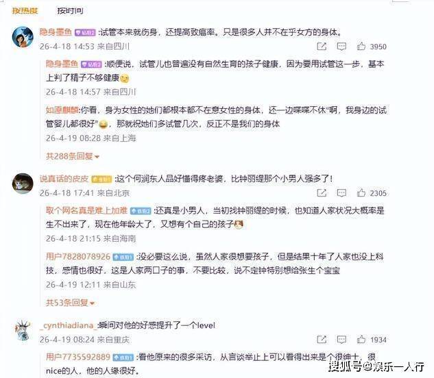 51岁的何润东在2026年4月突然翻红,抖音30天涨粉近200万。 人们发现,他和妻子林姵希结婚整整十年,没有孩子。 他拒绝试管婴儿的理由只有一句:“不想让她受人工助孕的苦。 ”另一边,55岁的钟丽缇坐在综艺录制现场,低着头不说话。 她小12岁的丈夫张伦硕对着镜头说,还想要一个孩子。 主持人提醒他钟丽缇的年龄,他回答:“肯定要有科技的准备与干预,不行就收养。 ”